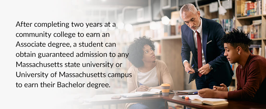 This path involves two years at a community college and two years at a public university. After completing two years at a community college to earn an Associate degree, a student can obtain guaranteed admission to any Massachusetts state university or University of Massachusetts campus to earn their Bachelor degree. This option allows for a minimum guaranteed transfer of 60 credits.